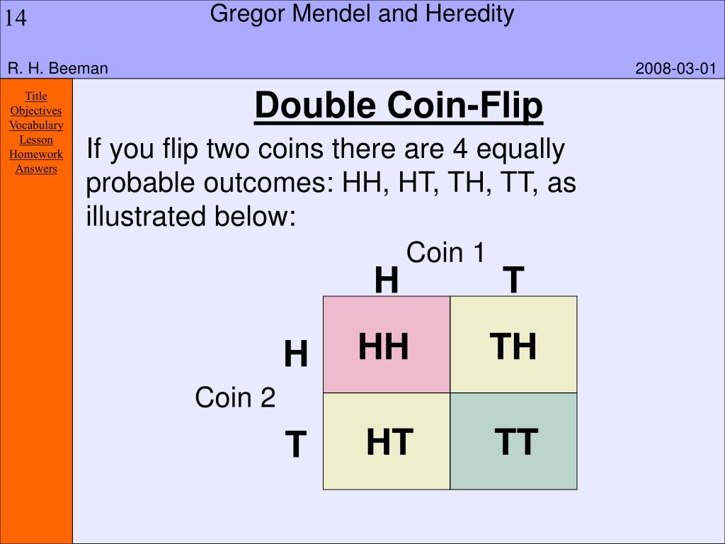 Double Coin-Flip If you flip two coins there are 4 equally probable outcomes: HH, HT, TH, TT, as illustrated below: Coin 1 H T HH TH H Coin 2 HT TT T