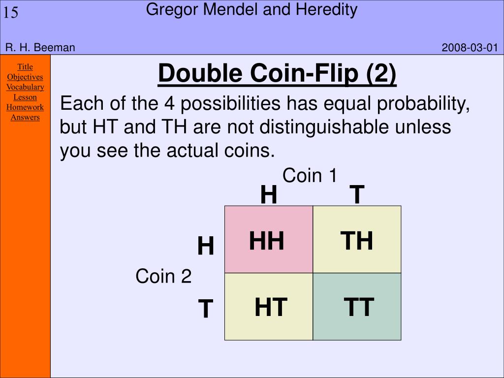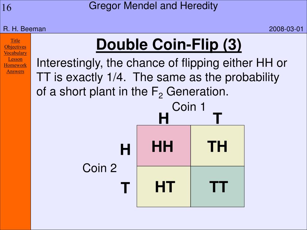 Double Coin-Flip (3) Interestingly, the chance of flipping either HH or TT is exactly 1/4. The same as the probability of a short plant in the F2 Generation. Coin 1 H T HH TH H Coin 2 HT TT T