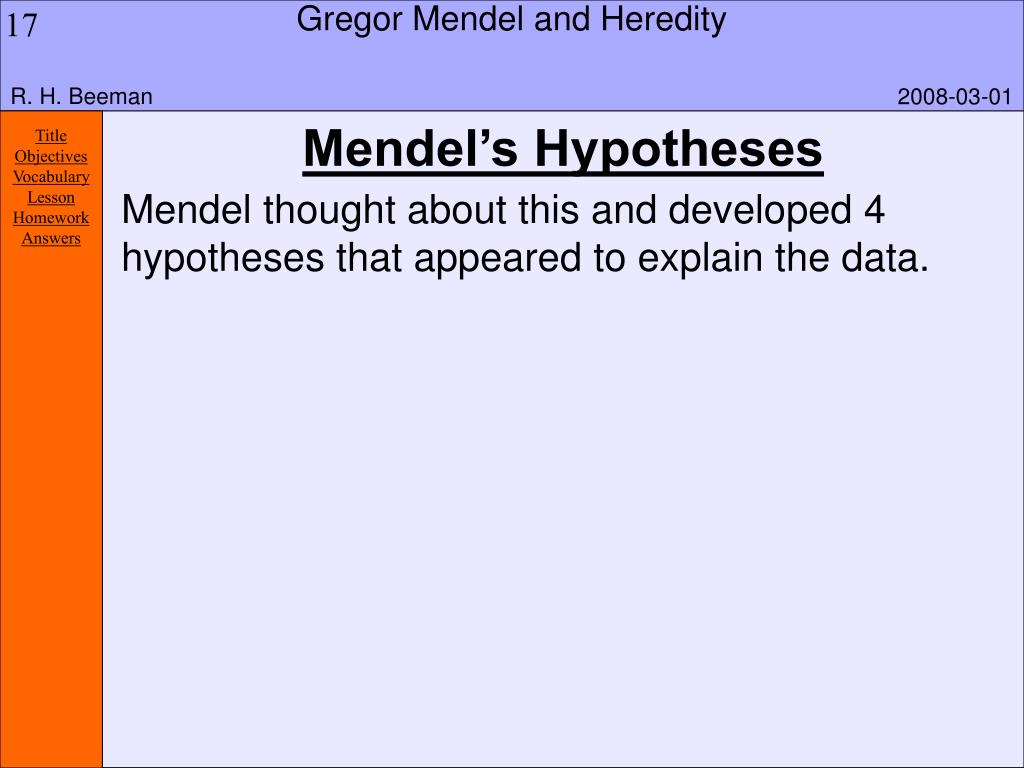 Mendel’s Hypotheses Mendel thought about this and developed 4 hypotheses that appeared to explain the data.