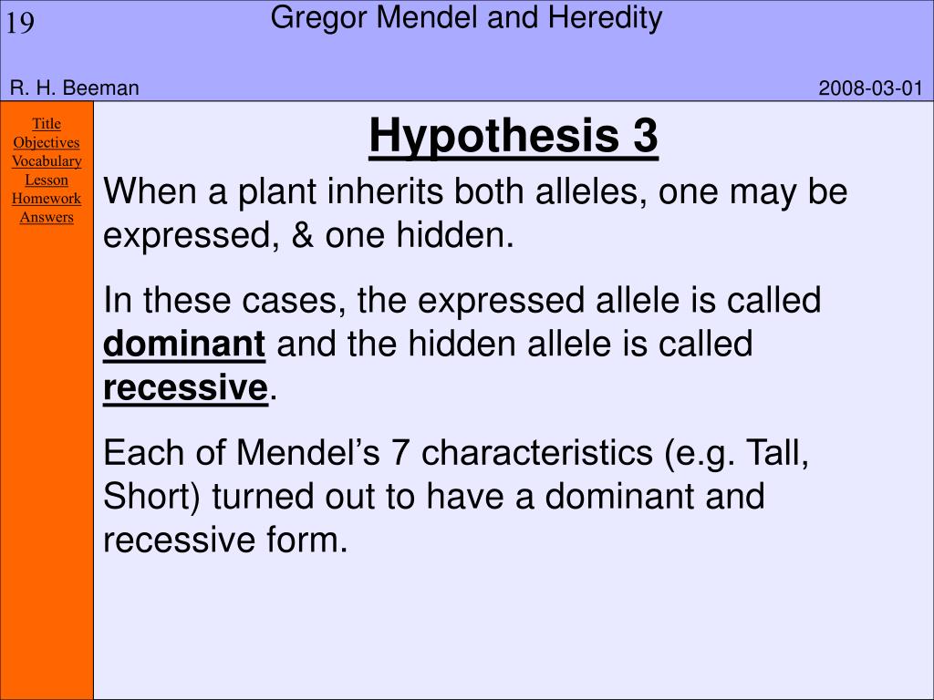 Hypothesis 3 When a plant inherits both alleles, one may be expressed, & one hidden. In these cases, the expressed allele is called dominant and the hidden allele is called recessive. Each of Mendel’s 7 characteristics (e.g. Tall, Short) turned out to have a dominant and recessive form.