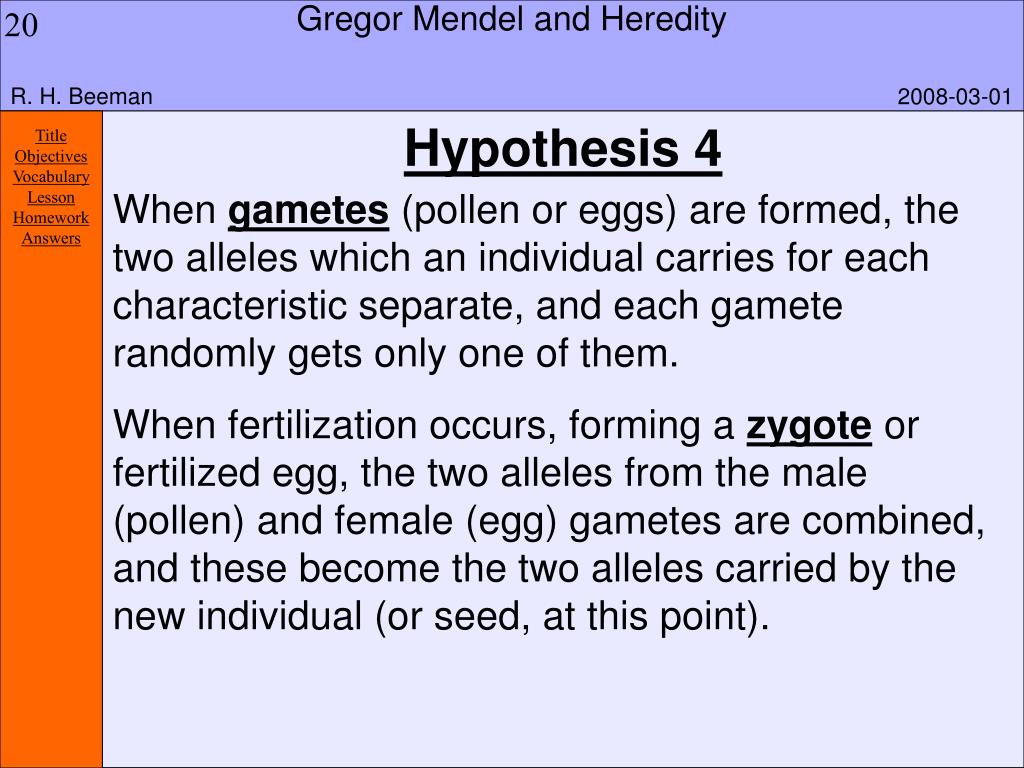 Hypothesis 4 When gametes (pollen or eggs) are formed, the two alleles which an individual carries for each characteristic separate, and each gamete randomly gets only one of them. When fertilization occurs, forming a zygote or fertilized egg, the two alleles from the male (pollen) and female (egg) gametes are combined, and these become the two alleles carried by the new individual (or seed, at this point).