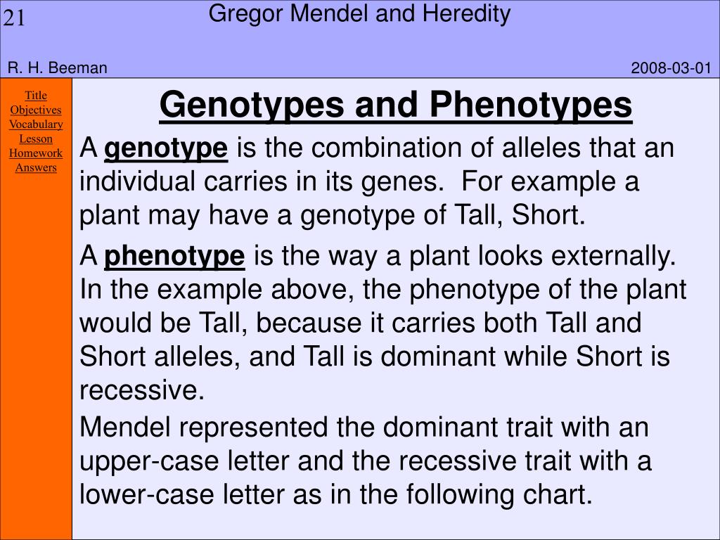 Genotypes and Phenotypes A genotype is the combination of alleles that an individual carries in its genes. For example a plant may have a genotype of Tall, Short. A phenotype is the way a plant looks externally. In the example above, the phenotype of the plant would be Tall, because it carries both Tall and Short alleles, and Tall is dominant while Short is recessive. Mendel represented the dominant trait with an upper-case letter and the recessive trait with a lower-case letter as in the following chart.