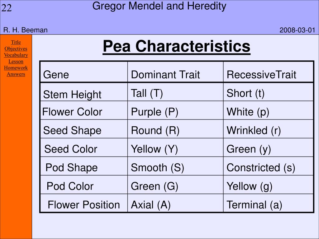 Pea Characteristics Gene Dominant Trait RecessiveTrait Tall (T) Short (t) Stem Height Flower Color Purple (P) White (p) Seed Shape Round (R) Wrinkled (r) Seed Color Yellow (Y) Green (y) Pod Shape Smooth (S) Constricted (s) Pod Color Green (G) Yellow (g) Flower Position Axial (A) Terminal (a)