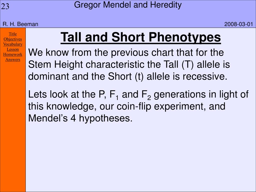 Tall and Short Phenotypes We know from the previous chart that for the Stem Height characteristic the Tall (T) allele is dominant and the Short (t) allele is recessive. Lets look at the P, F1 and F2 generations in light of this knowledge, our coin-flip experiment, and Mendel’s 4 hypotheses.