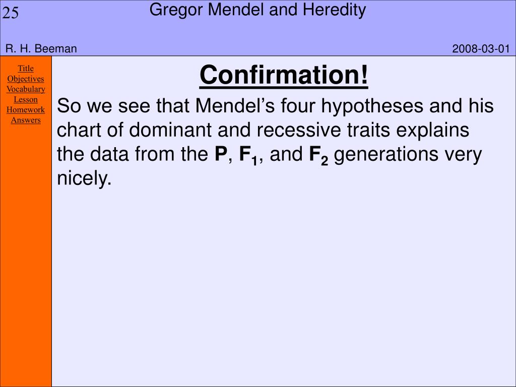 Confirmation! So we see that Mendel’s four hypotheses and his chart of dominant and recessive traits explains the data from the P, F1, and F2 generations very nicely.