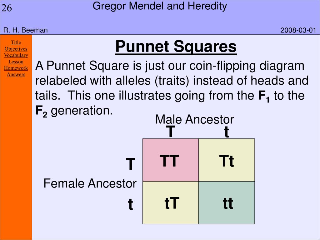 Punnet Squares A Punnet Square is just our coin-flipping diagram relabeled with alleles (traits) instead of heads and tails. This one illustrates going from the F1 to the F2 generation. Male Ancestor T t TT Tt T Female Ancestor tT tt t