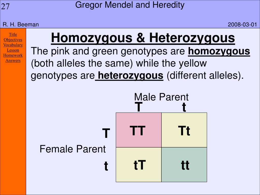 Homozygous & Heterozygous The pink and green genotypes are homozygous(both alleles the same) while the yellow genotypes areheterozygous (different alleles). Male Parent T t TT Tt T Female Parent tT tt t