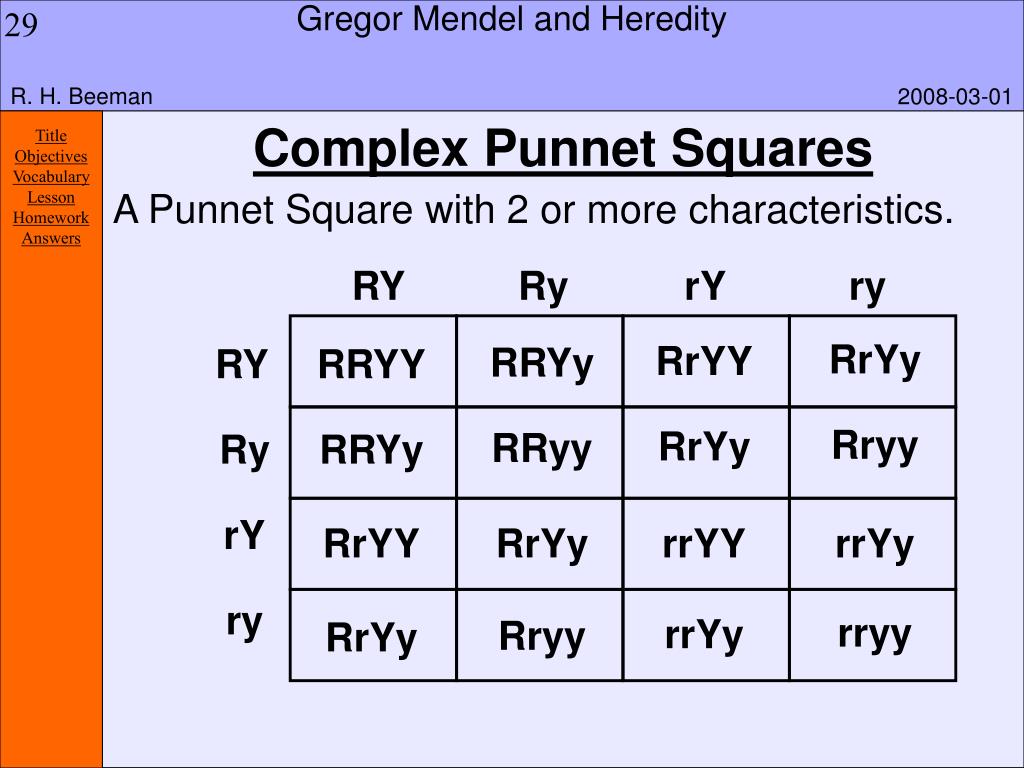 Complex Punnet Squares A Punnet Square with 2 or more characteristics. RY Ry rY ry RrYy RrYY RRYy RY RRYY Rryy RrYy RRyy Ry RRYy rY RrYY RrYy rrYY rrYy ry rryy rrYy Rryy RrYy