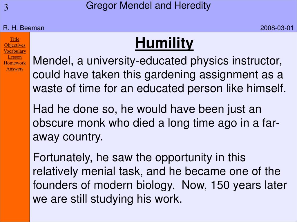 Humility Mendel, a university-educated physics instructor, could have taken this gardening assignment as a waste of time for an educated person like himself. Had he done so, he would have been just an obscure monk who died a long time ago in a far-away country. Fortunately, he saw the opportunity in this relatively menial task, and he became one of the founders of modern biology. Now, 150 years later we are still studying his work.