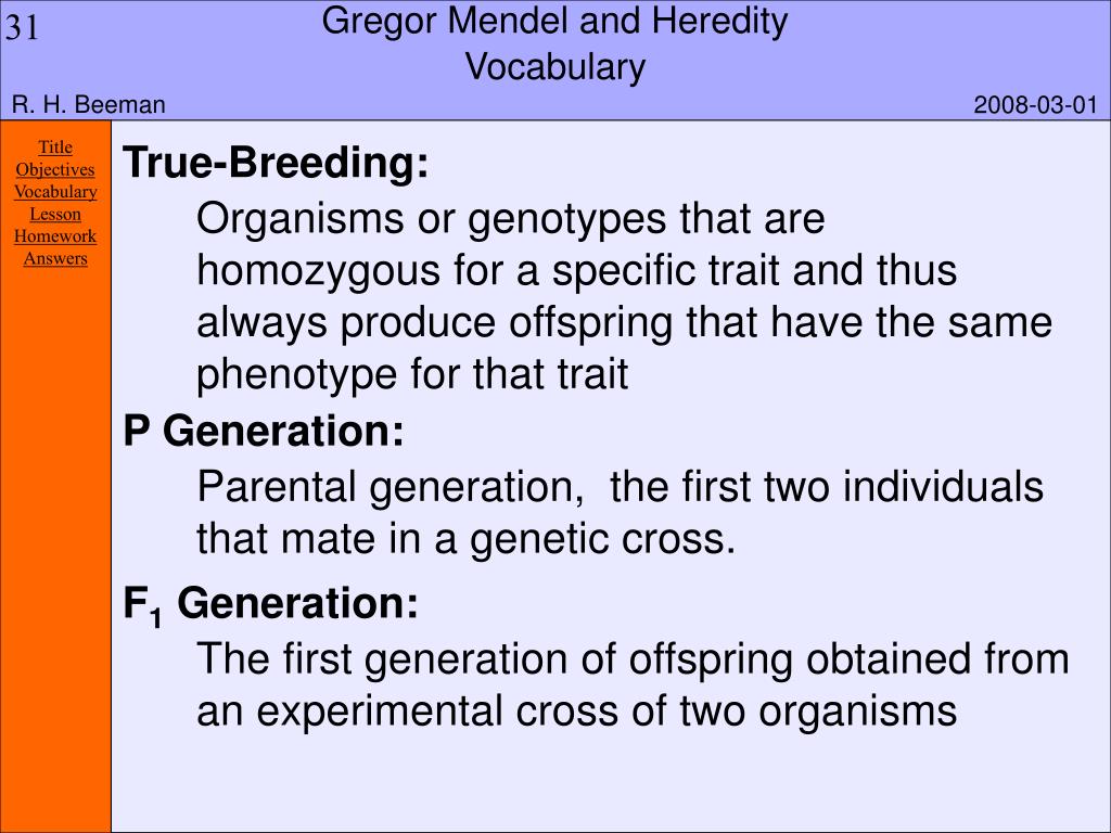 True-Breeding: P Generation: F1 Generation: Organisms or genotypes that are homozygous for a specific trait and thus always produce offspring that have the same phenotype for that trait Parental generation, the first two individuals that mate in a genetic cross. The first generation of offspring obtained from an experimental cross of two organisms Vocabulary