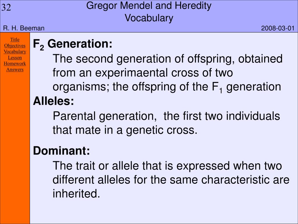 F2 Generation: Alleles: Dominant: The second generation of offspring, obtained from an experimaental cross of two organisms; the offspring of the F1 generation Parental generation, the first two individuals that mate in a genetic cross. The trait or allele that is expressed when two different alleles for the same characteristic are inherited. Vocabulary
