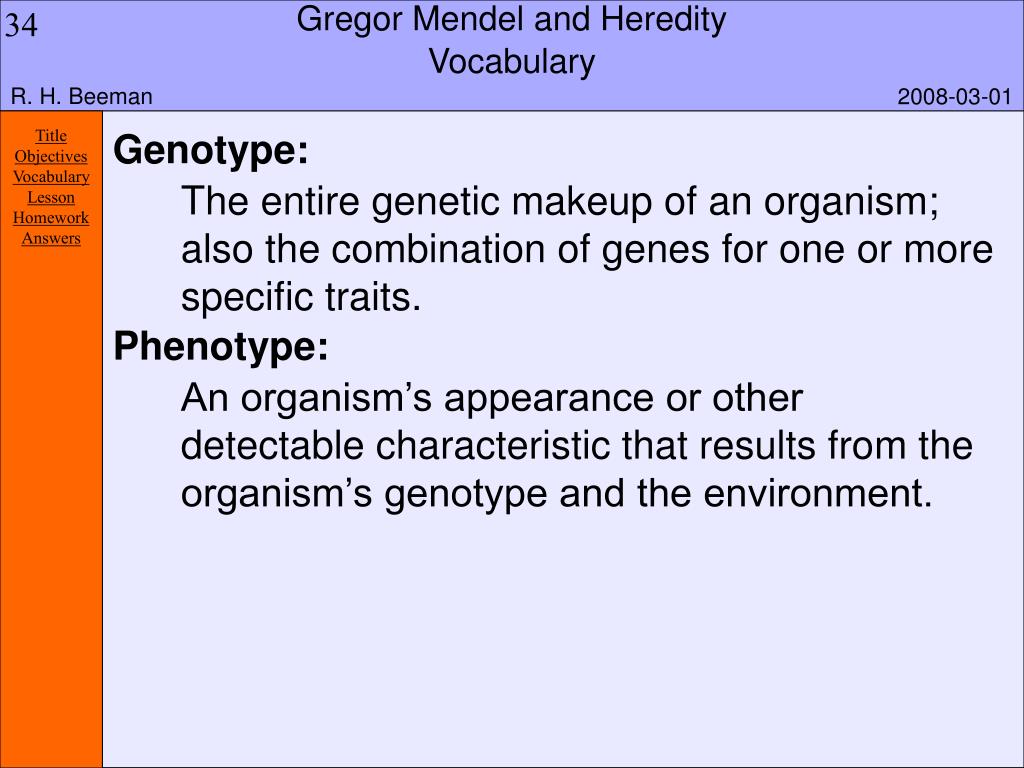 Genotype: Phenotype: The entire genetic makeup of an organism; also the combination of genes for one or more specific traits. An organism’s appearance or other detectable characteristic that results from the organism’s genotype and the environment. Vocabulary