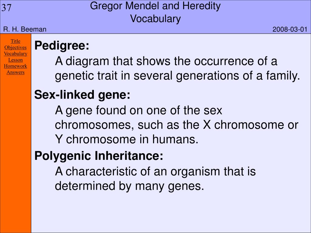 Pedigree: Sex-linked gene: Polygenic Inheritance: A diagram that shows the occurrence of a genetic trait in several generations of a family. A gene found on one of the sex chromosomes, such as the X chromosome or Y chromosome in humans. A characteristic of an organism that is determined by many genes. Vocabulary
