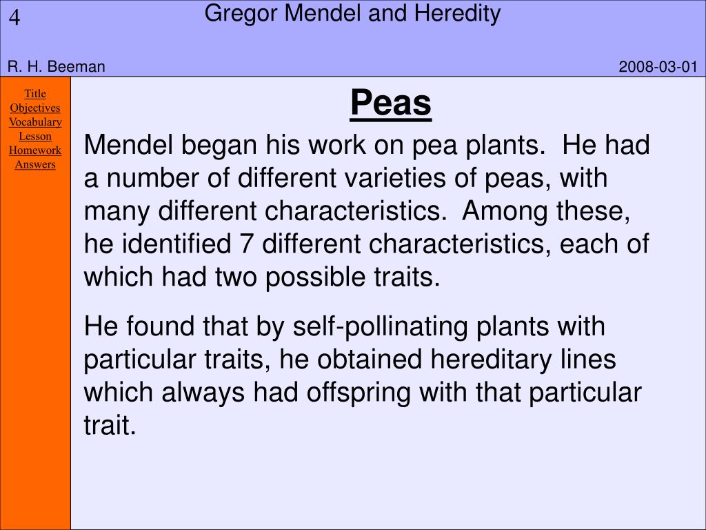 Peas Mendel began his work on pea plants. He had a number of different varieties of peas, with many different characteristics. Among these, he identified 7 different characteristics, each of which had two possible traits. He found that by self-pollinating plants with particular traits, he obtained hereditary lines which always had offspring with that particular trait.