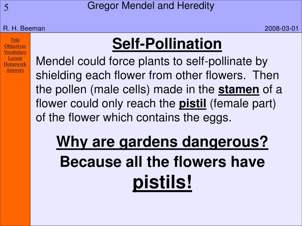 Self-Pollination Mendel could force plants to self-pollinate by shielding each flower from other flowers. Then the pollen (male cells) made in the stamen of a flower could only reach the pistil (female part) of the flower which contains the eggs. Why are gardens dangerous? Because all the flowers have pistils!