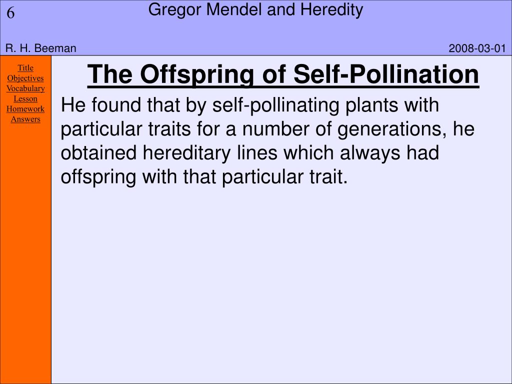 The Offspring of Self-Pollination He found that by self-pollinating plants with particular traits for a number of generations, he obtained hereditary lines which always had offspring with that particular trait.