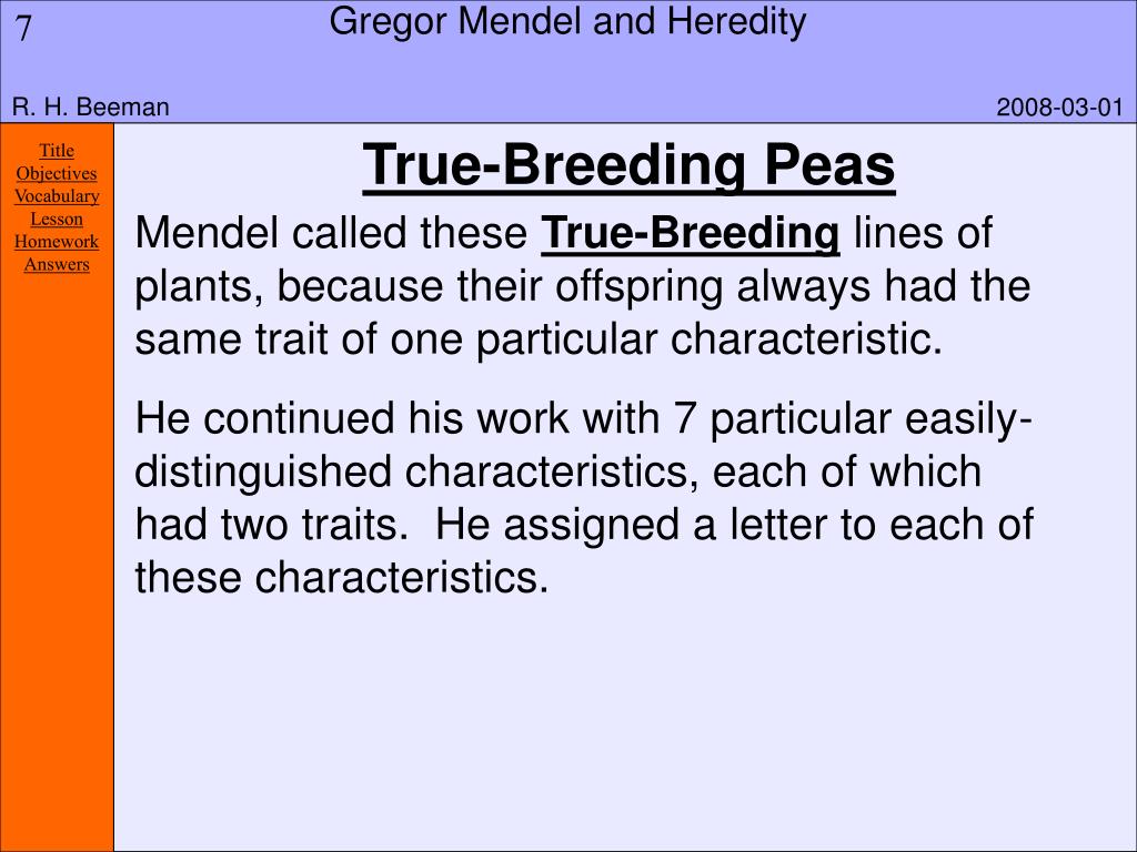 True-Breeding Peas Mendel called these True-Breeding lines of plants, because their offspring always had the same trait of one particular characteristic. He continued his work with 7 particular easily-distinguished characteristics, each of which had two traits. He assigned a letter to each of these characteristics.