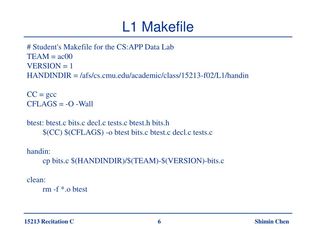 L1 Makefile # Student's Makefile for the CS:APP Data Lab TEAM = ac00 VERSION = 1 HANDINDIR = /afs/cs.cmu.edu/academic/class/15213-f02/L1/handin CC = gcc CFLAGS = -O -Wall btest: btest.c bits.c decl.c tests.c btest.h bits.h $(CC) $(CFLAGS) -o btest bits.c btest.c decl.c tests.c handin: cp bits.c $(HANDINDIR)/$(TEAM)-$(VERSION)-bits.c clean: rm -f *.o btest