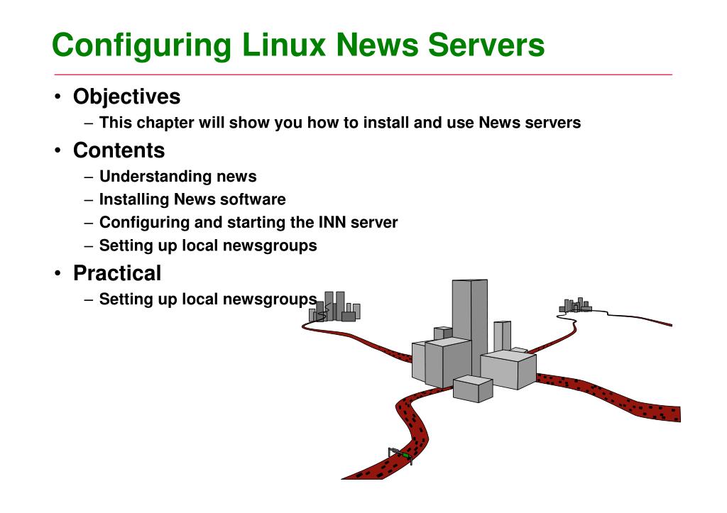Configuring Linux News Servers. Objectives This chapter will show you how to install and use News servers Contents Understanding news Installing News software Configuring and starting the INN server Setting up local newsgroups Practical Setting up local newsgroups.