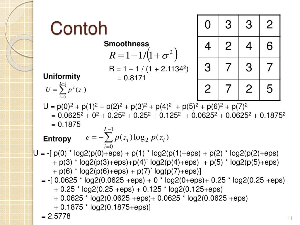 Contoh Smoothness R = 1 – 1 / (1 + 2.11342) = 0.8171 Uniformity U = p(0)2 + p(1)2 + p(2)2 + p(3)2 + p(4)2 + p(5)2 + p(6)2 + p(7)2 = 0.06252 + 02 + 0.252 + 0.252 + 0.1252 + 0.06252 + 0.06252 + 0.18752 = 0.1875 Entropy U = -[ p(0) * log2(p(0)+eps) + p(1) * log2(p(1)+eps) + p(2) * log2(p(2)+eps) + p(3) * log2(p(3)+eps)+p(4)* log2(p(4)+eps) + p(5) * log2(p(5)+eps) + p(6) * log2(p(6)+eps) + p(7)* log(p(7)+eps)] = -[ 0.0625 * log2(0.0625 +eps) + 0 * log2(0+eps)+ 0.25 * log2(0.25 +eps) + 0.25 * log2(0.25 +eps) + 0.125 * log2(0.125+eps) + 0.0625 * log2(0.0625 +eps)+ 0.0625 * log2(0.0625 +eps) + 0.1875 * log2(0.1875+eps)] = 2.5778