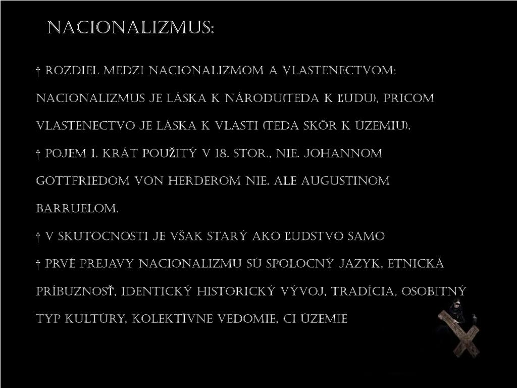 Nacionalizmus: † Rozdiel medzi nacionalizmom a vlastenectvom: Nacionalizmus je láska k národu(teda k Ľudu), priCom vlastenectvo je láska k vlasti (teda skôr k územiu). † pojem 1. krát pouŽitý v 18. stor., nie. Johannom gottfriedom von herderom nie. Ale Augustinom Barruelom. † V skutocnosti je vŠak starý ako Ľudstvo samo † prvé prejavy nacionalizmu sú spoloCnýjazyk, etnická príbuznosŤ, identický historický vývoj, tradícia, osobitný typ kultúry, kolektívne vedomie, Ci územie