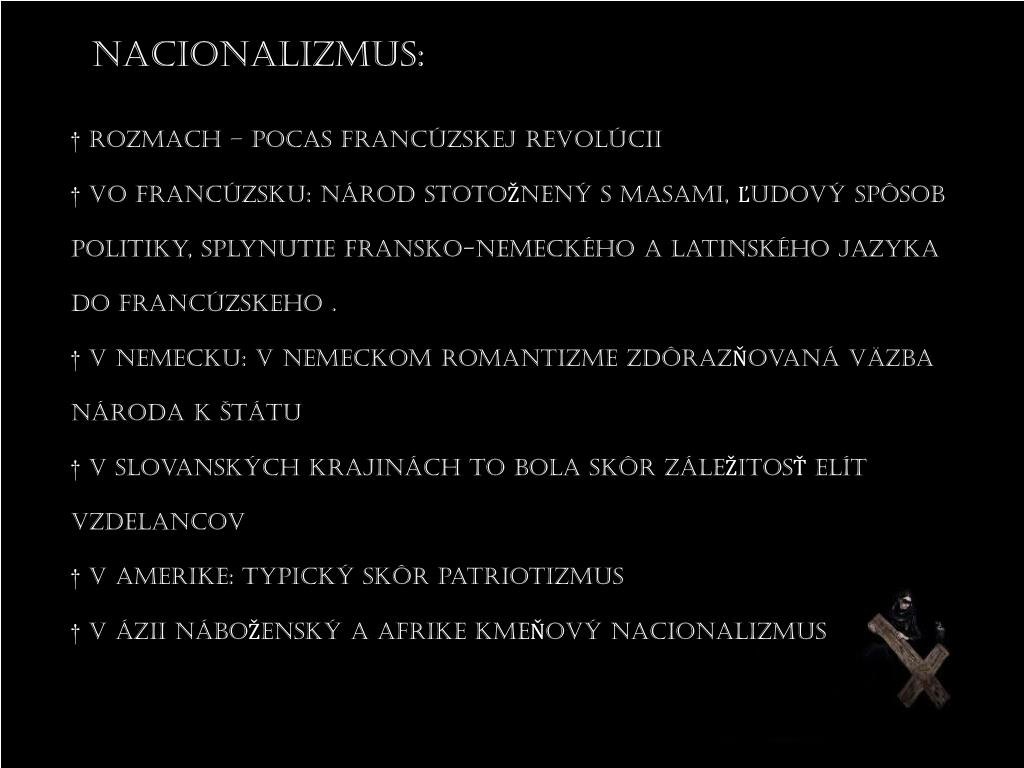 Nacionalizmus: † rozmach – pocas francúzskej revolúcii † vo francúzsku: národ stotoŽnený s masami, Ľudový spôsob politiky, splynutie fransko-nemeckého a latinského jazyka do francúzskeho . † v nemecku: v nemeckom romantizme zdôrazŇovaná väzba národa k Štátu † v Slovanských krajinách to bola skôr záleŽitosŤ elít vzdelancov † v amerike: typický skôr patriotizmus † v áziináboŽenský a afrikekmeŇový nacionalizmus