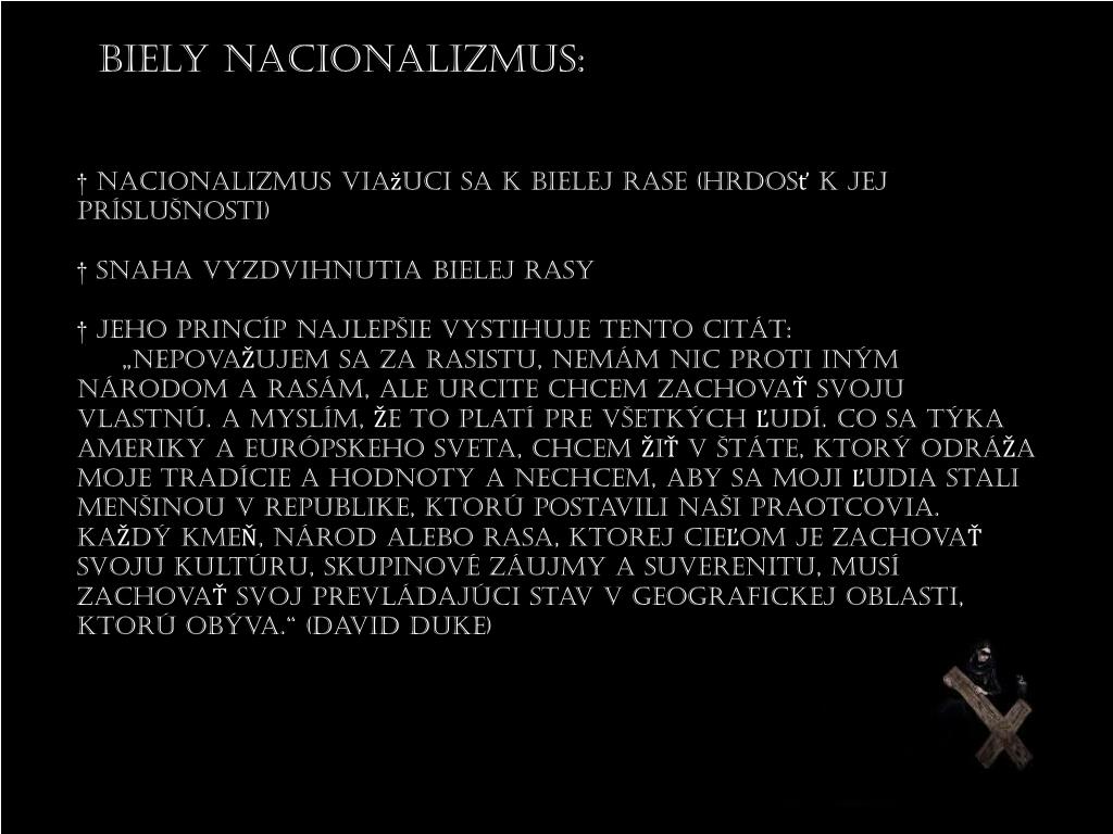 Biely Nacionalizmus: † Nacionalizmus viažuci sa k bielej rase (hrdosť k jej príslušnosti) † Snaha vyzdvihnutia bielej rasy † Jeho princíp najlepšie vystihuje tento citát: „NepovaŽujemsa za rasistu, nemám nicproti iným národom a rasám, ale urcitechcem zachovaŤsvoju vlastnú. A myslím, Že to platí pre všetkých Ľudí. cosa týka Ameriky a európskeho sveta, chcem ŽiŤv štáte, ktorý odráŽamoje tradície a hodnoty a nechcem, aby sa moji Ľudia stali menšinou v republike, ktorú postavili naši praotcovia. KaŽdýkmeŇ, národ alebo rasa, ktorej cieĽomje zachovaŤsvoju kultúru, skupinové záujmy a suverenitu, musí zachovaŤsvoj prevládajúci stav v geografickej oblasti, ktorú obýva.“ (DavidDuke)