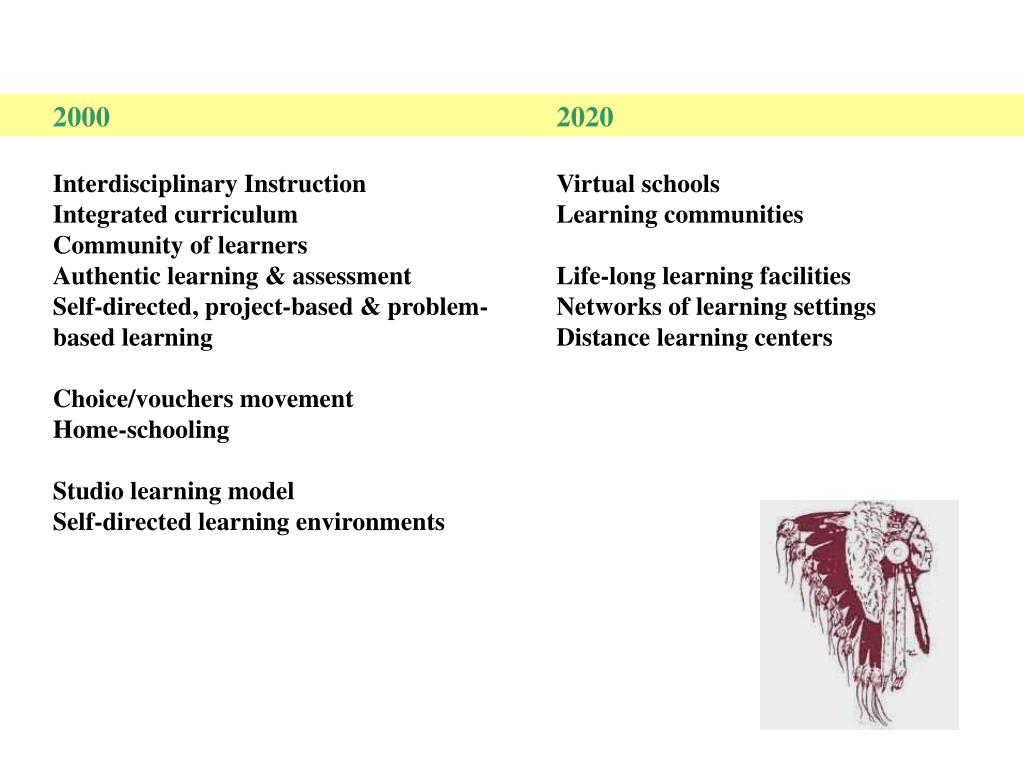 Historical Changes in Education 2000 Interdisciplinary Instruction Integrated curriculum Community of learners Authentic learning & assessment Self-directed, project-based & problem-based learning Choice/vouchers movement Home-schooling Studio learning model Self-directed learning environments 2020 Virtual schools Learning communities Life-long learning facilities Networks of learning settings Distance learning centers