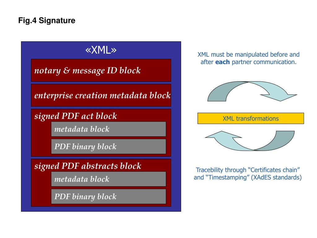 «XML» XML must be manipulated before and after each partner communication. notary & message ID block enterprise creation metadata block signed PDF act block XML transformations metadata block PDF binary block signed PDF abstracts block Tracebility through “Certificates chain” and “Timestamping” (XAdES standards) metadata block PDF binary block Fig.4 Signature