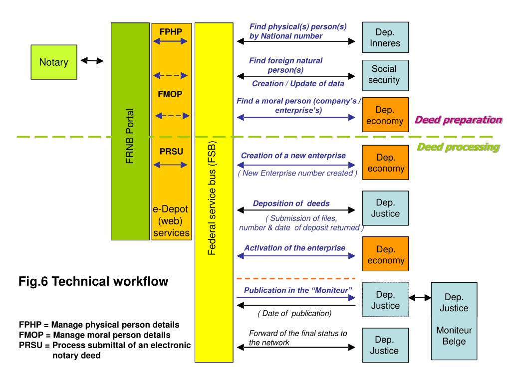 Find physical(s) person(s) by National number FPHP Dep. Inneres RRN Find foreign natural person(s) Notary Notariaat Social security KSZ Creation / Update of data FMOP Find a moral person (company’s / enterprise’s) Dep. economy FOD Deed preparation Economie FRNB Portal Deed processing PRSU Creation of a new enterprise Dep. economy FOD Economie ( New Enterprise number created ) KFBN FSB - - NOT Federal service bus (FSB) Dep. Justice FOD Deposition of deeds e-Depot (web) services Justitie ( Submission of files, number & date of deposit returned ) Activation of the enterprise FOD Dep. economy Economie Publication in the “Moniteur” Dep. Justice FOD Dep. Justice Moniteur Belge Justitie BS ( Date of publication) FPHP = Manage physical person details FMOP = Manage moral person details PRSU = Process submittal of an electronic notary deed Forward of the final status to the network Dep. Justice FOD Justitie Fig.6 Technical workflow