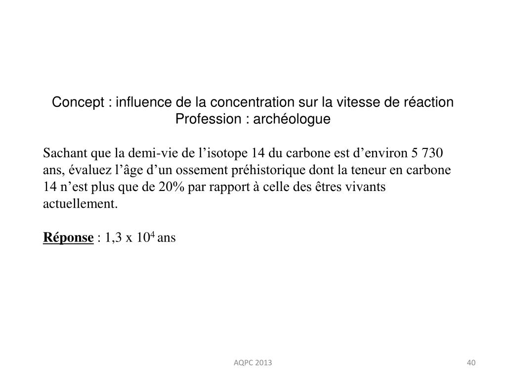 Concept : influence de la concentration sur la vitesse de réaction Profession : archéologue Sachant que la demi-vie de l’isotope 14 du carbone est d’environ 5 730 ans, évaluez l’âge d’un ossement préhistorique dont la teneur en carbone 14 n’est plus que de 20% par rapport à celle des êtres vivants actuellement. Réponse : 1,3 x 104ans AQPC 2013