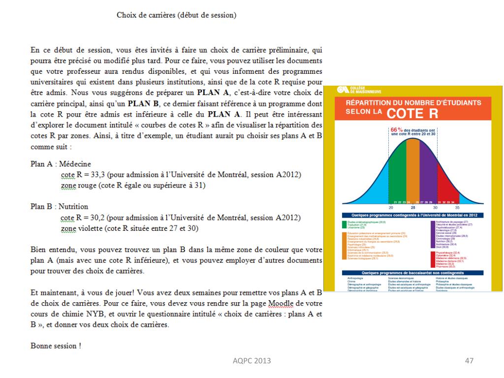 Les débuts • Témoignages d’étudiants • Demi-journées pédagogiques = contamination • La réalité des étudiants • La motivation au travail • Quand on veut on peut! • Pourquoi je travaille? • Quels sont mes objectifs? • La moitié des étudiants ne savent pas ce qu’ils veulent / 2/3 de ceux qui le savent veulent aller en médecine / après le 1er examen, la plupart ne savent plus… AQPC 2013