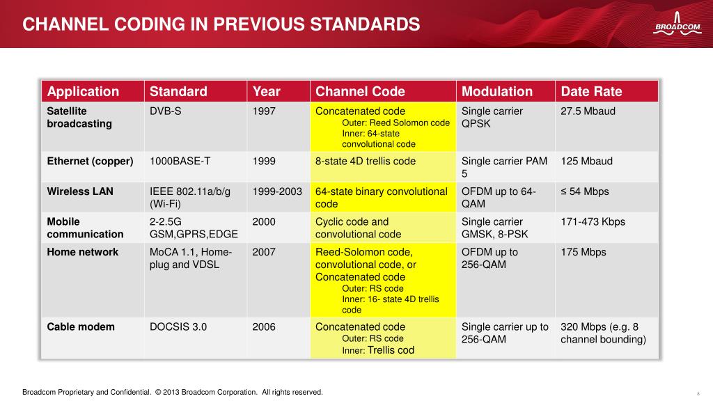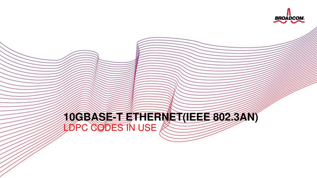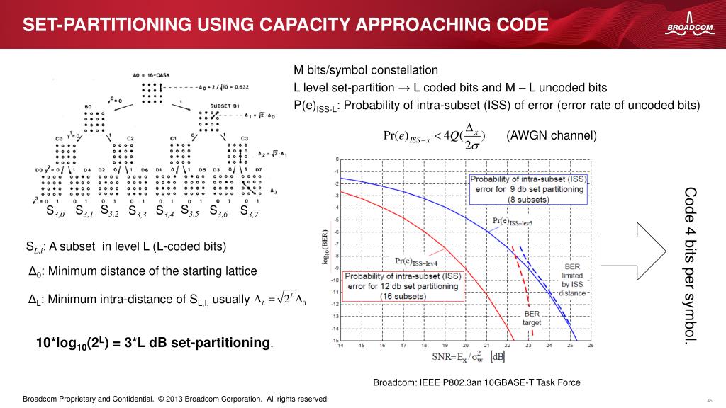 Set-partitioning using capacity approaching code M bits/symbol constellation L level set-partition → L coded bits and M – L uncoded bits P(e)ISS-L: Probability of intra-subset (ISS) of error (error rate of uncodedbits) (AWGN channel) S3,5 S3,2 S3,1 S3,6 S3,0 S3,4 S3,7 S3,3 Code 4 bits per symbol. SL,i: A subset in level L (L-coded bits) Δ0: Minimum distance of the starting lattice ΔL: Minimum intra-distance of SL,I, usually 10*log10(2L) = 3*L dB set-partitioning. Broadcom: IEEE P802.3an 10GBASE-T Task Force