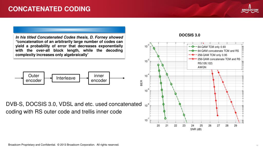 Concatenated coding DOCSIS 3.0 In his titled Concatenated Codes thesis, D. Forney showed “concatenation of an arbitrarily large number of codes can yield a probability of error that decreases exponentially with the over-all block length, while the decoding complexity increases only algebraically” Outer encoder inner encoder Interleave DVB-S, DOCSIS 3.0, VDSL and etc. used concatenated coding with RS outer code and trellis inner code