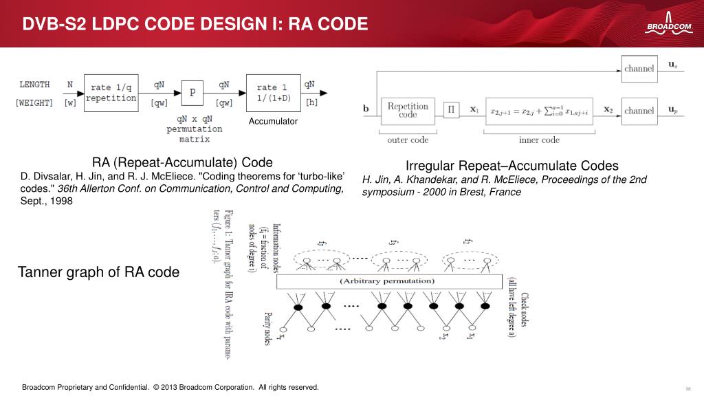 DVB-S2 LDPC code design I: RA code Accumulator RA (Repeat-Accumulate) Code D. Divsalar, H. Jin, and R. J. McEliece. "Coding theorems for ‘turbo-like’ codes." 36th Allerton Conf. on Communication, Control and Computing,Sept., 1998 Irregular Repeat–Accumulate Codes H. Jin, A. Khandekar, and R. McEliece, Proceedings of the 2nd symposium - 2000 in Brest, France Tanner graph of RA code