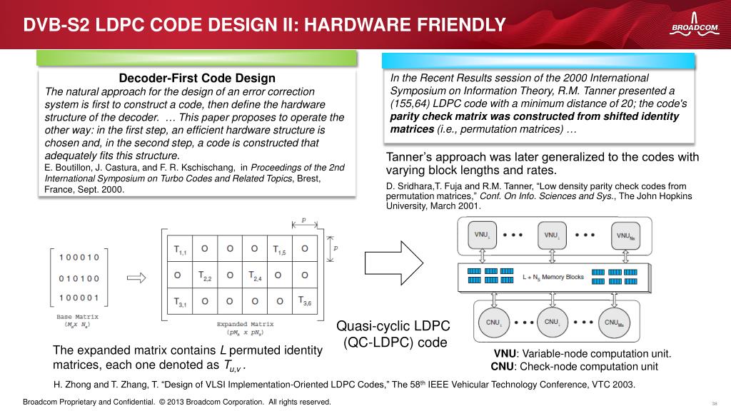 DVB-S2 LDPC code design II: hardware friendly Tanner’s approach was later generalized to the codes with varying block lengths and rates. D. Sridhara,T. Fuja and R.M. Tanner, “Low density parity check codes from permutation matrices,” Conf. On Info. Sciences and Sys., The John Hopkins University, March 2001. VNU: Variable-node computation unit. CNU:Check-node computation unit The expanded matrix contains L permuted identity matrices, each one denoted as Tu,v. In the Recent Results session of the 2000 International Symposium on Information Theory, R.M. Tanner presented a (155,64) LDPC code with a minimum distance of 20; the code's parity check matrix was constructed from shifted identity matrices (i.e., permutation matrices) … Decoder-First Code Design The natural approach for the design of an error correction system is first to construct a code, then define the hardware structure of the decoder. … This paper proposes to operate the other way: in the first step, an efficient hardware structure is chosen and, in the second step, a code is constructed that adequately fits this structure. E. Boutillon, J. Castura, and F. R. Kschischang, in Proceedings of the 2nd International Symposium on Turbo Codes and Related Topics, Brest, France, Sept. 2000. Quasi-cyclic LDPC (QC-LDPC) code H. Zhong and T. Zhang, T. “Design of VLSI Implementation-Oriented LDPC Codes,” The 58th IEEE Vehicular Technology Conference, VTC 2003.