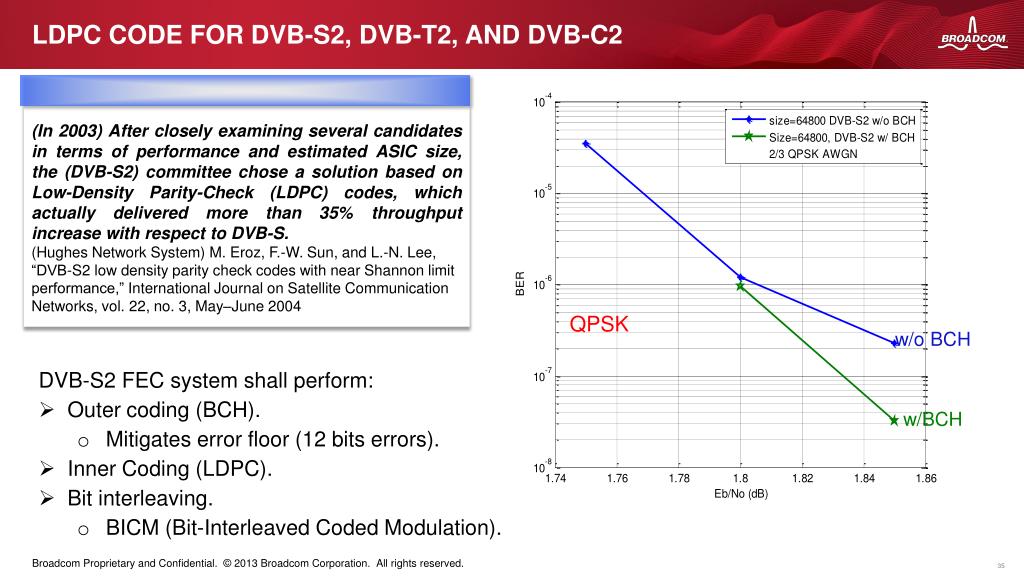 LDPC code for DVB-S2, DVB-T2, and DVB-C2 QPSK w/o BCH (In 2003) After closely examining several candidates in terms of performance and estimated ASIC size, the (DVB-S2) committee chose a solution based on Low-Density Parity-Check (LDPC) codes, which actually delivered more than 35% throughput increase with respect to DVB-S. (Hughes Network System) M. Eroz, F.-W. Sun, and L.-N. Lee, “DVB-S2 low density parity check codes with near Shannon limit performance,” International Journal on Satellite Communication Networks, vol. 22, no. 3, May–June 2004 • DVB-S2 FEC system shall perform: • Outer coding (BCH). • Mitigates error floor (12 bits errors). • Inner Coding (LDPC). • Bit interleaving. • BICM (Bit-Interleaved Coded Modulation). w/BCH