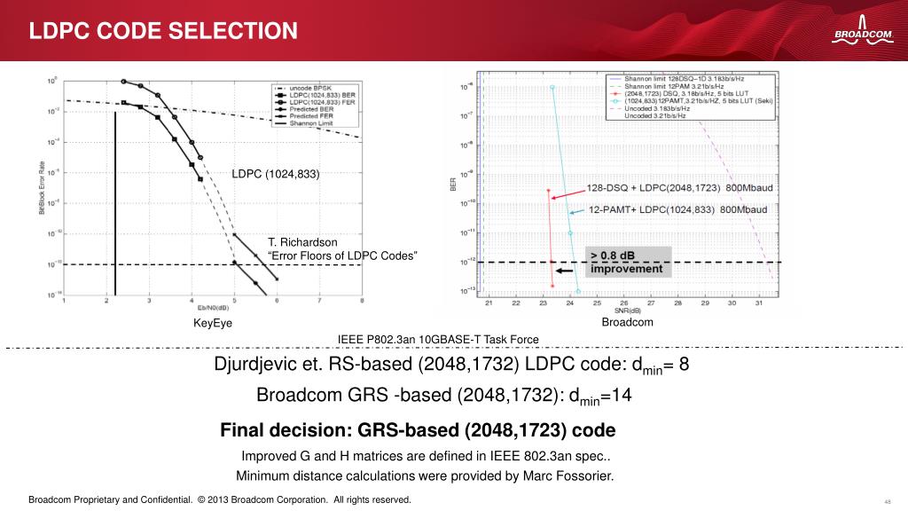 LDPC code selection LDPC (1024,833) T. Richardson “Error Floors of LDPC Codes” Broadcom KeyEye IEEE P802.3an 10GBASE-T Task Force Djurdjevic et. RS-based (2048,1732) LDPC code: dmin= 8 Broadcom GRS -based (2048,1732): dmin=14 Final decision: GRS-based (2048,1723) code Improved G and H matrices are defined in IEEE 802.3an spec.. Minimum distance calculations were provided by Marc Fossorier.