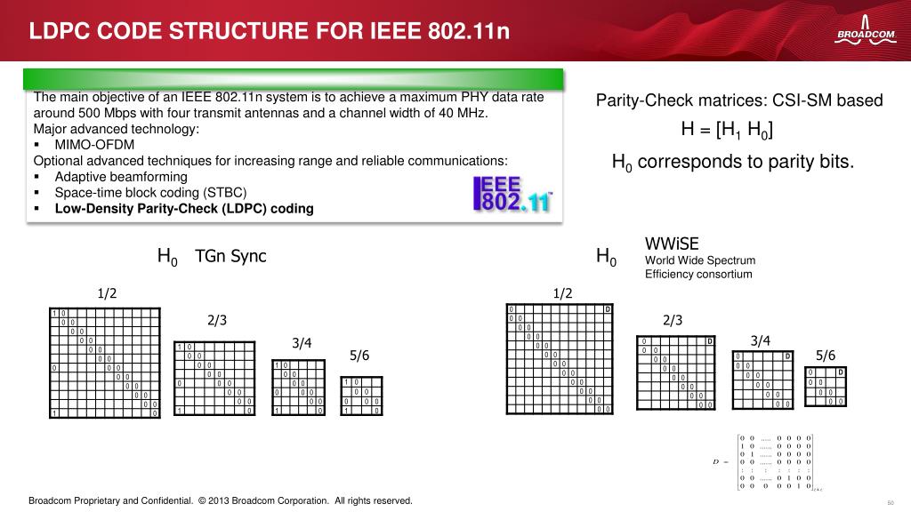 LDPC Code structure for IEEE 802.11n Parity-Check matrices: CSI-SM based H = [H1 H0] H0 corresponds to parity bits. WWiSE World Wide Spectrum Efficiency consortium TGn Sync H0 H0 1/2 1/2 • The main objective of an IEEE 802.11n system is to achieve a maximum PHY data rate around 500 Mbps with four transmit antennas and a channel width of 40 MHz. • Major advanced technology: • MIMO-OFDM • Optional advanced techniques for increasing range and reliable communications: • Adaptive beamforming • Space-time block coding (STBC) • Low-Density Parity-Check (LDPC) coding 2/3 2/3 3/4 3/4 5/6 5/6