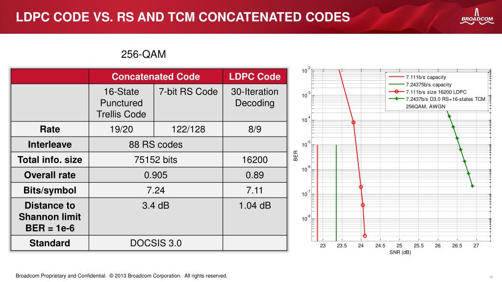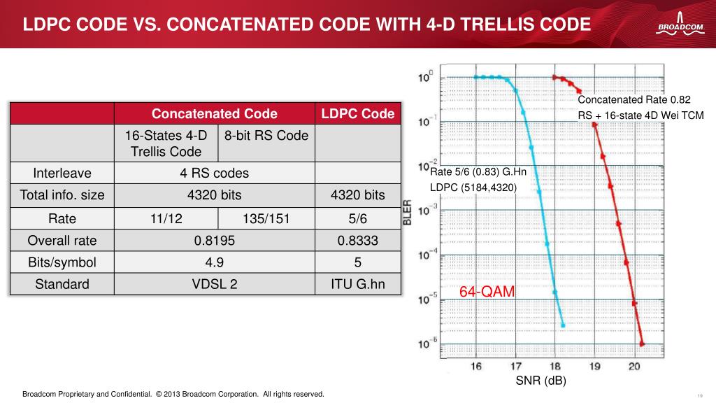 LDPC code vs. concatenated code with 4-D trellis code Concatenated Rate 0.82 RS + 16-state 4D Wei TCM Rate 5/6 (0.83) G.Hn LDPC (5184,4320) 64-QAM SNR (dB)