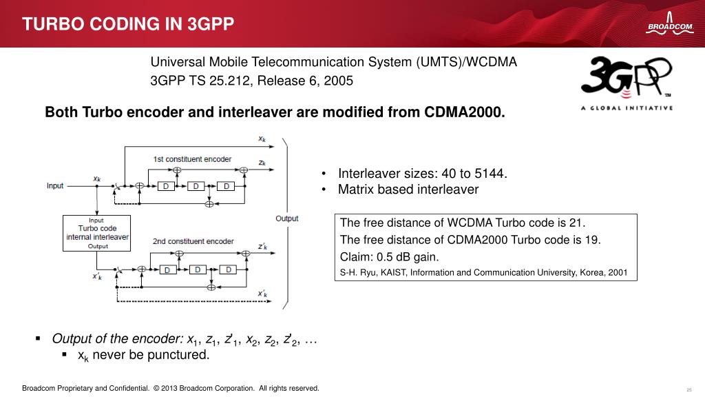 Turbo coding in 3GPP Universal Mobile Telecommunication System (UMTS)/WCDMA 3GPP TS 25.212, Release 6, 2005 Both Turbo encoder and interleaver are modified from CDMA2000. • Interleaver sizes: 40 to 5144. • Matrix based interleaver The free distance of WCDMA Turbo code is 21. The free distance of CDMA2000 Turbo code is 19. Claim: 0.5 dB gain. S-H. Ryu, KAIST, Information and Communication University, Korea, 2001 • Output of the encoder: x1, z1, z'1, x2, z2, z'2, … • xk never be punctured.