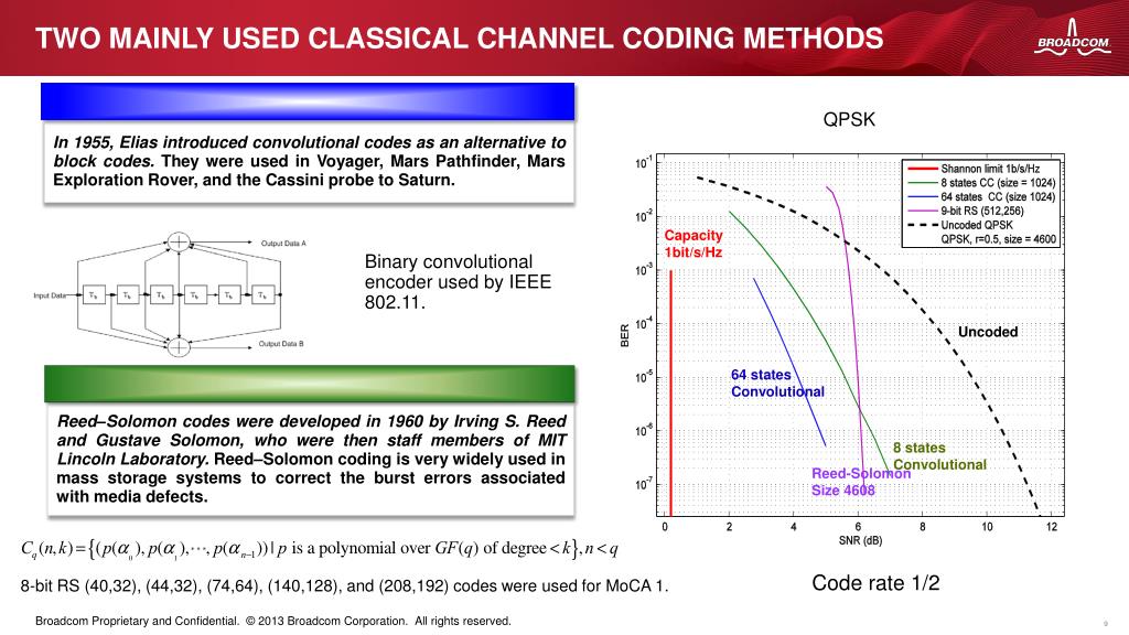 Two mainly used classical channel coding methods QPSK Capacity 1bit/s/Hz Binary convolutional encoder used by IEEE 802.11. Uncoded In 1955, Elias introduced convolutional codes as an alternative to block codes. They were used in Voyager, Mars Pathfinder, Mars Exploration Rover, and the Cassini probe to Saturn. Reed–Solomon codes were developed in 1960 by Irving S. Reed and Gustave Solomon, who were then staff members of MIT Lincoln Laboratory. Reed–Solomon coding is very widely used in mass storage systems to correct the burst errors associated with media defects. 64 states Convolutional 8 states Convolutional Reed-Solomon Size 4608 Code rate 1/2 8-bit RS (40,32), (44,32), (74,64), (140,128), and (208,192) codes were used for MoCA 1.