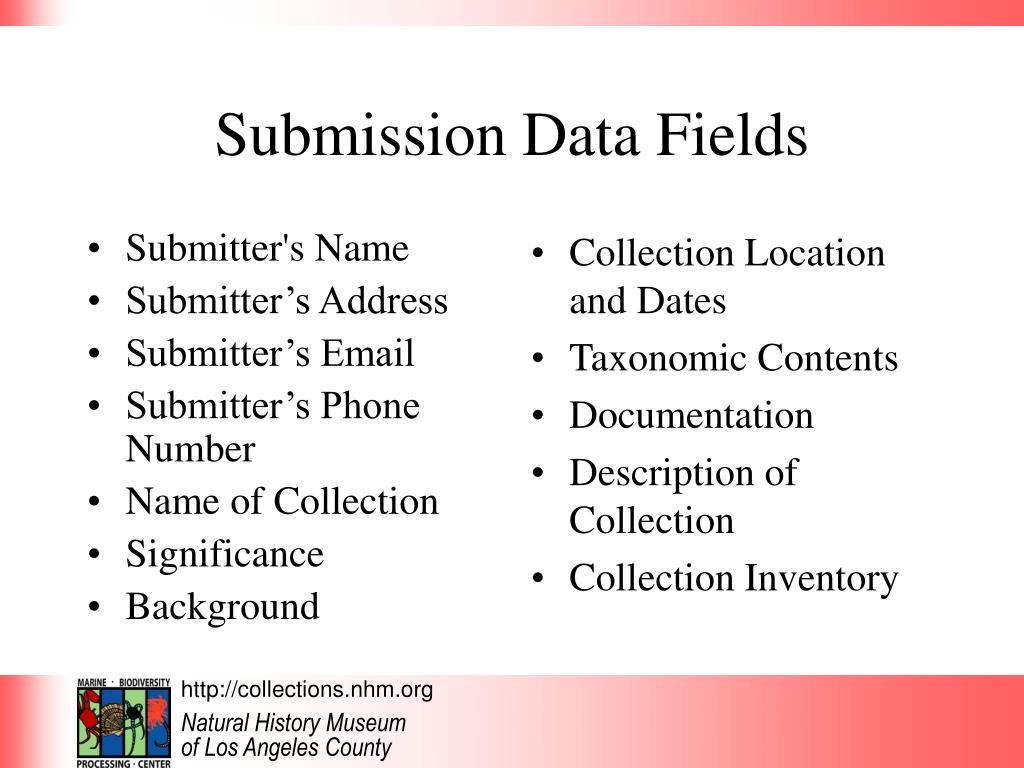 Submitter's Name Submitter’s Address Submitter’s Email Submitter’s Phone Number Name of Collection Significance Background Collection Location and Dates Taxonomic Contents Documentation Description of Collection Collection Inventory Submission Data Fields