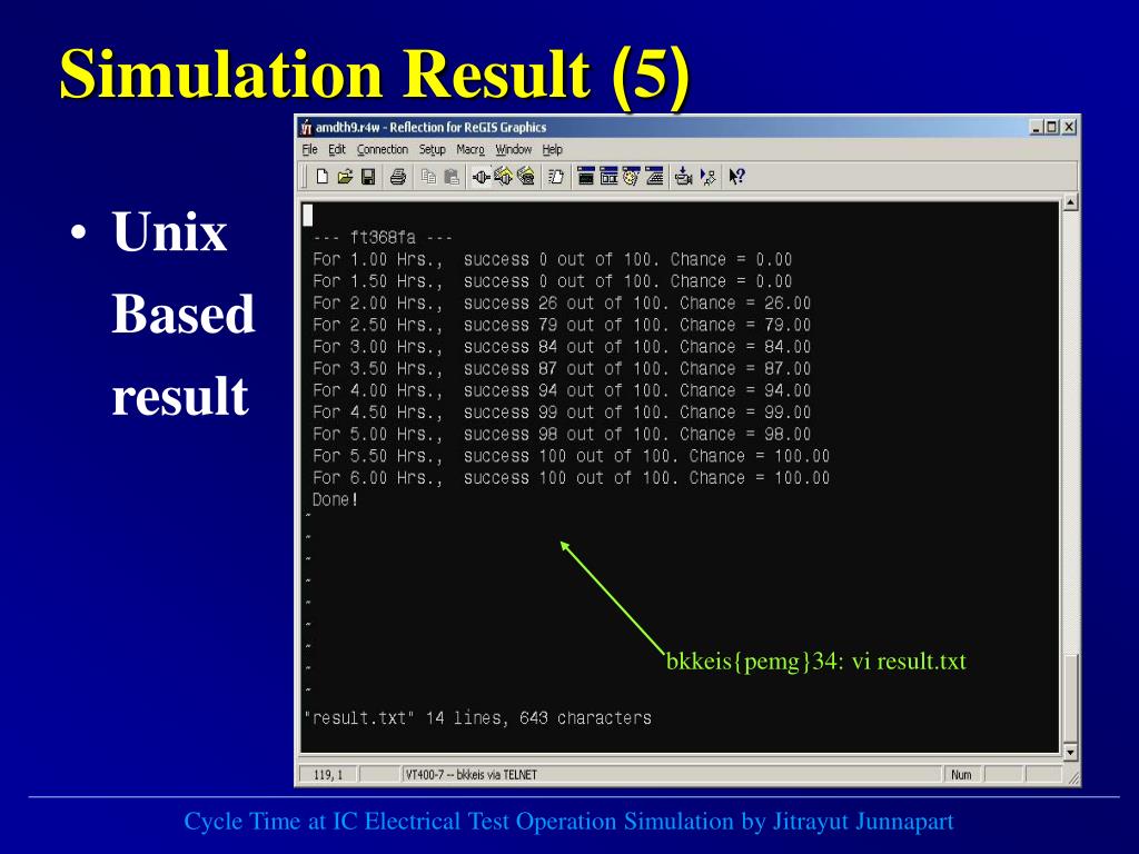 Simulation Result (5) • Unix Based result bkkeis{pemg}34: vi result.txt Cycle Time at IC Electrical Test Operation Simulation by Jitrayut Junnapart