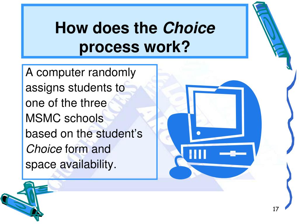 How does the Choice process work? A computer randomly assigns students to one of the three MSMC schools based on the student’s Choice form and space availability.