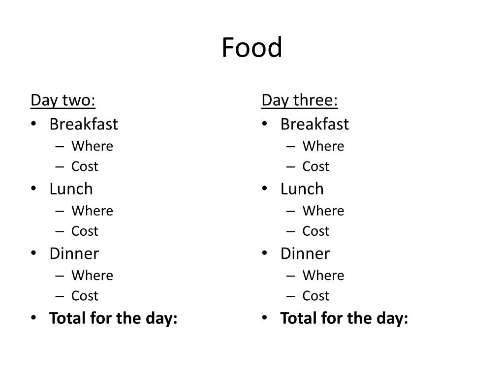 Food Day two: • Breakfast • Where • Cost • Lunch • Where • Cost • Dinner • Where • Cost • Total for the day: Day three: • Breakfast • Where • Cost • Lunch • Where • Cost • Dinner • Where • Cost • Total for the day: