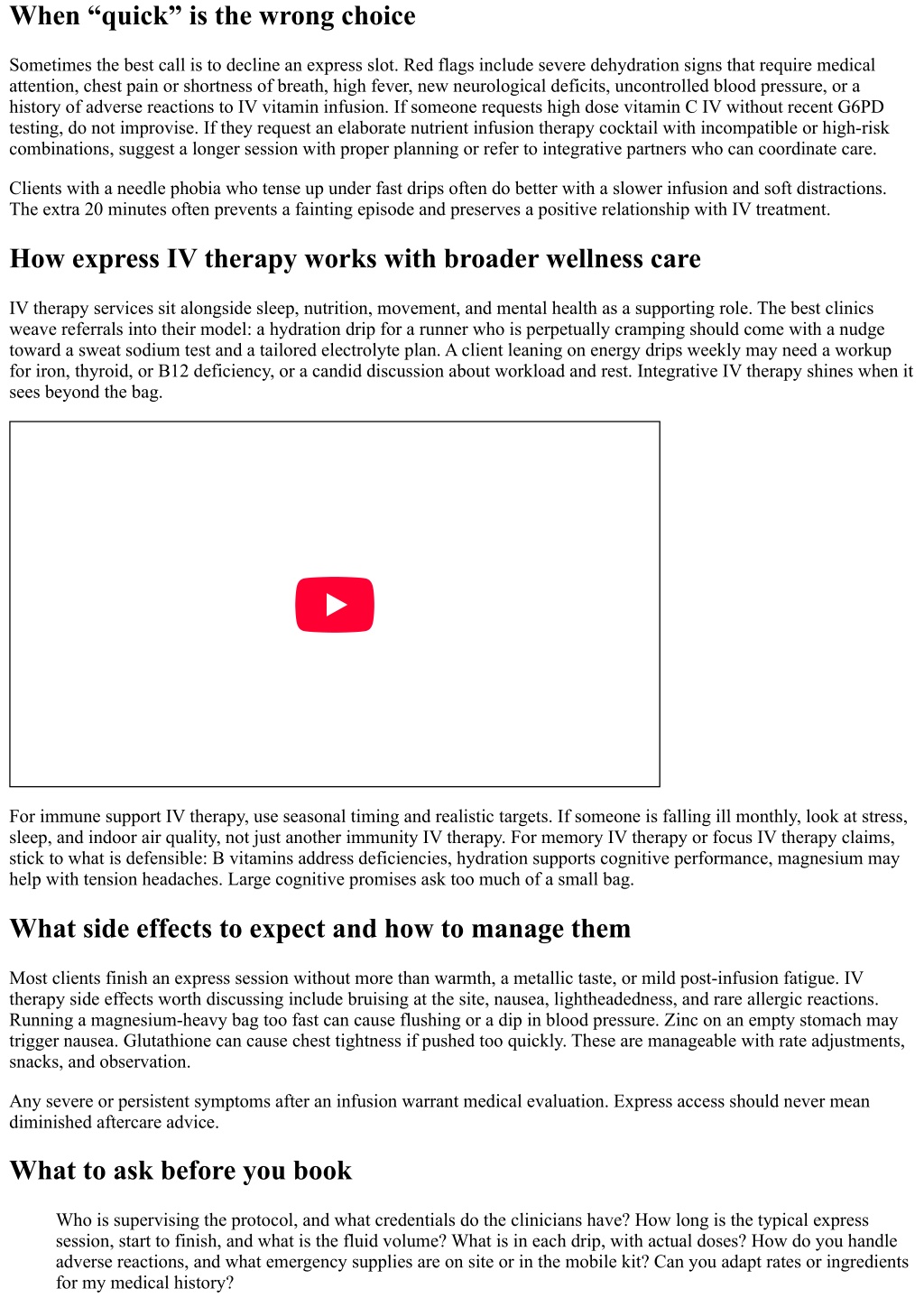 When “quick” is the wrong choice Sometimes the best call is to decline an express slot. Red flags include severe dehydration signs that require medical attention, chest pain or shortness of breath, high fever, new neurological deficits, uncontrolled blood pressure, or a history of adverse reactions to IV vitamin infusion. If someone requests high dose vitamin C IV without recent G6PD testing, do not improvise. If they request an elaborate nutrient infusion therapy cocktail with incompatible or high-risk combinations, suggest a longer session with proper planning or refer to integrative partners who can coordinate care. Clients with a needle phobia who tense up under fast drips often do better with a slower infusion and soft distractions. The extra 20 minutes often prevents a fainting episode and preserves a positive relationship with IV treatment. How express IV therapy works with broader wellness care IV therapy services sit alongside sleep, nutrition, movement, and mental health as a supporting role. The best clinics weave referrals into their model: a hydration drip for a runner who is perpetually cramping should come with a nudge toward a sweat sodium test and a tailored electrolyte plan. A client leaning on energy drips weekly may need a workup for iron, thyroid, or B12 deficiency, or a candid discussion about workload and rest. Integrative IV therapy shines when it sees beyond the bag. For immune support IV therapy, use seasonal timing and realistic targets. If someone is falling ill monthly, look at stress, sleep, and indoor air quality, not just another immunity IV therapy. For memory IV therapy or focus IV therapy claims, stick to what is defensible: B vitamins address deficiencies, hydration supports cognitive performance, magnesium may help with tension headaches. Large cognitive promises ask too much of a small bag. What side effects to expect and how to manage them Most clients finish an express session without more than warmth, a metallic taste, or mild post-infusion fatigue. IV therapy side effects worth discussing include bruising at the site, nausea, lightheadedness, and rare allergic reactions. Running a magnesium-heavy bag too fast can cause flushing or a dip in blood pressure. Zinc on an empty stomach may trigger nausea. Glutathione can cause chest tightness if pushed too quickly. These are manageable with rate adjustments, snacks, and observation. Any severe or persistent symptoms after an infusion warrant medical evaluation. Express access should never mean diminished aftercare advice. What to ask before you book Who is supervising the protocol, and what credentials do the clinicians have? How long is the typical express session, start to finish, and what is the fluid volume? What is in each drip, with actual doses? How do you handle adverse reactions, and what emergency supplies are on site or in the mobile kit? Can you adapt rates or ingredients for my medical history?
