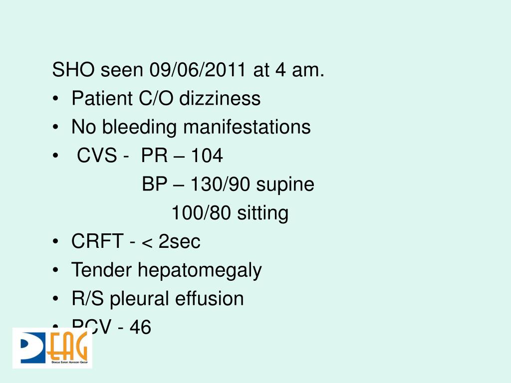 SHO seen 09/06/2011 at 4 am. • Patient C/O dizziness • No bleeding manifestations • CVS - PR – 104 BP – 130/90 supine 100/80 sitting • CRFT - < 2sec • Tender hepatomegaly • R/S pleural effusion • PCV - 46