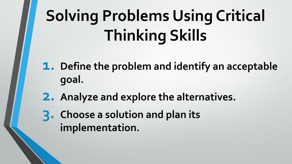 Solving Problems Using Critical Thinking Skills Define the problem and identify an acceptable goal. Analyze and explore the alternatives. Choose a solution and plan its implementation.