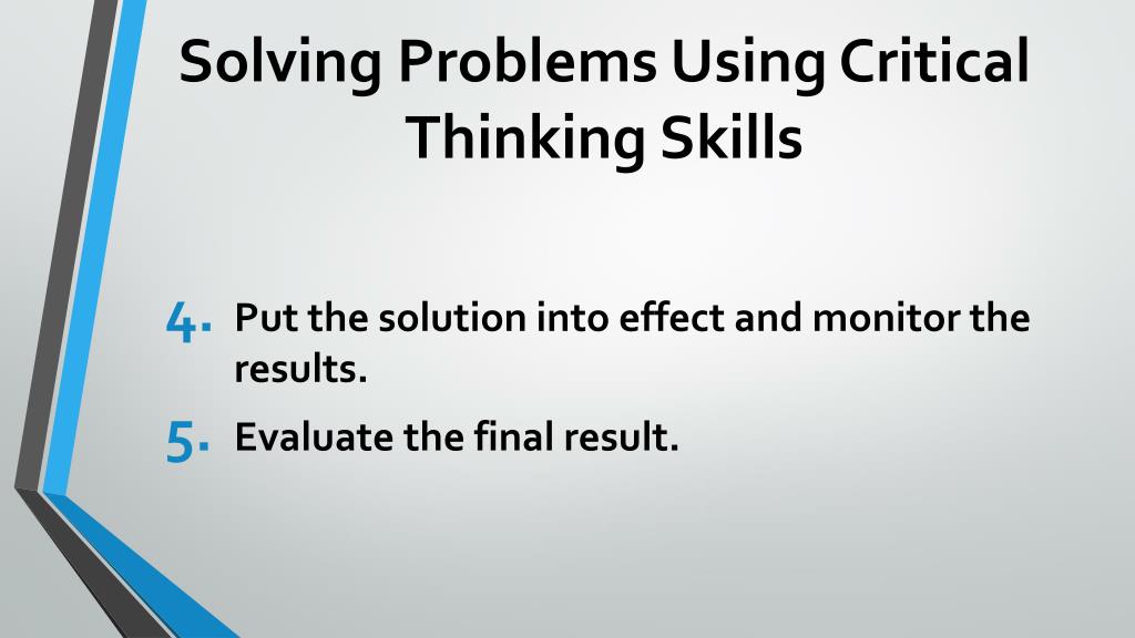 Solving Problems Using Critical Thinking Skills Put the solution into effect and monitor the results. Evaluate the final result.